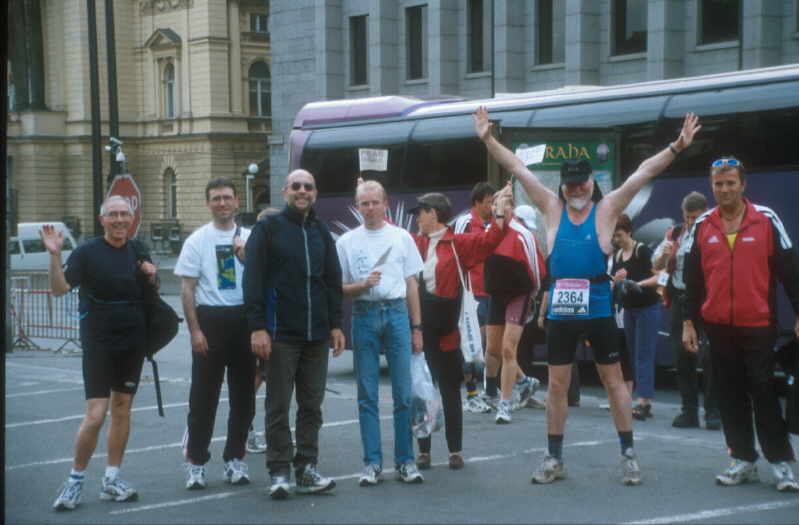 So etwa 30 Leutchen fuhren mit nach Prag, neun davon wollten den Marathon laufen, der Rest waren Angehörige oder Läufer, die aber nicht laufen wollten und nur mitfuhren, weil es eine günstige Gelegenheit war. Einige der mitreisenden Läufer, die auch in Prag laufen wollten, hatten ständig Durst. Wie es der Zufall so wollte ;-) hatte der Busfahrer "einige wenige" Flaschen Bier dabei, gut gekühlt in einem Kühlfach, so dass sie zu trinken hatten. Offensichtlich trinken die Leute, die aus der Gegend von Bitburg kommen, nur Bier, und wie sich später herausstellte, ersetzte das zu 80 Prozent auch das Training in der Vorbereitungszeit - wenigstens vermute ich das auf Grund der schlechten Zeiten, die die in Prag gelaufen sind. Immer wieder während der ganzen Fahrt, so etwa 5-6 Mal kam Rudi nach vorne, holte sieben Flaschen Bier und verschwand dann wieder in den dunklen Tiefen der hinteren Abteilung. Mit meiner gewissenhaften Einstellung zum Laufen ;-) konnte ich mir das natürlich nicht antun, aber vermutlich brauchten das meine Freunde aus Wißmannsdorf, zumindest versicherte das Rudi :-). Nun ja, wie gesagt, das böse Ende kam dann beim Lauf - bis auf einen lagen alle weit hinter ihrer Marathon-Bestzeit, teilweise brauchten sie über eine Stunde länger. Natürlich lag das nicht an dem vielen Bier - Prag hatte da ja auch einiges zu bieten - sondern an allen möglichen unglücklichen Umständen, z.B. auch daran, dass ein paar das Wochenende zuvor beim weltberühmten Eifel-Marathon mitgemacht hatten.