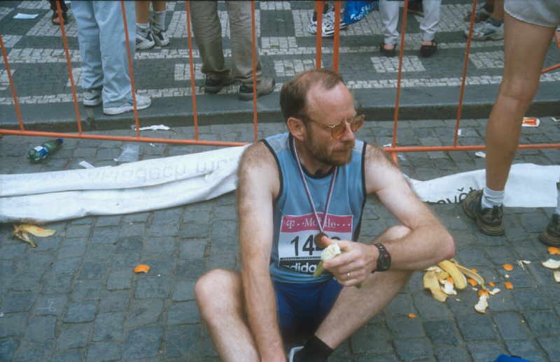 Irgendwann sollten mir jetzt bald die Spitzenläufer entgegen kommen. Der Prag Marathon verläuft auf einer Wendepunktstrecke auf der ab etwa Kilometer sieben Hin- und Rückweg auf der selben Straße verliefen. Tatsächlich, etwa zwischen Kilometer 17 und 18 kam mir das Führungsfahrzeug entgegen, eine überdimensionale Digitaluhr auf dem Dach, die die Zeit für die Spitzenläufer anzeigte, ein paar weitere Fahrzeuge und Motorräder vorneweg. Dicht hinter dem Führungswagen dann die Spitzengruppe: lauter schwarze Läufer, etwa 5-6. Wie immer war ich beeindruckt von deren unglaublichem Tempo, schneller als mein 400 Meter Tempo! und das einen ganzen Marathon lang. Wie mir ging es wohl allen um mich herum, keiner klatschte, man war einfach noch nicht darauf gefaßt. Das änderte sich, als uns kaum eine Minute später ein einzelner Läufer entgegen kam. Alle klatschten wir Beifall, auch noch bei den nächsten Läufern, unter denen jetzt die ersten hellhäutigen waren. Dann hatten wir uns daran gewöhnt, es war selbstverständlich und wir trotteten wieder wie zuvor, bis dann die ersten Frauen kamen. Wieder wurde freundlich Beifall geklatscht.